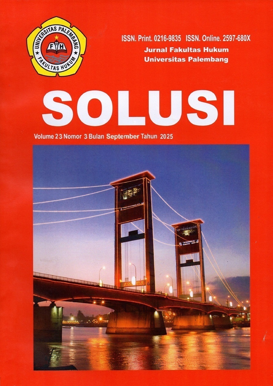 Solusi [p-ISSN: 0216-9835; e-ISSN: 2597-680X] is a peer-reviewed journal which is published by Faculty of Law, University of Palembang publishes three times a year in January, May, and September. This journal publishes current concept and research papers on Law and Society.